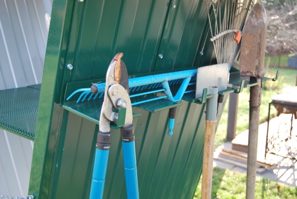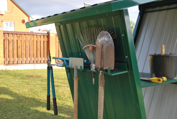 На внешних боковых стенках органайзера имеются кронштейны-подвесы (полки и крюки) для хранения инвентаря. На них могут быть размещены лопаты, грабли, электрические кабели, поливочные шланги и другие подобные вещи.