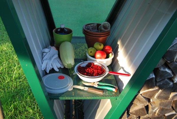 На четырех съемных полках могут быть размещены: ведра, тазы, горшки, пакеты и мешки с удобрениями, семенной материал, опрыскиватели, мелкий инвентарь и инструменты. А также собранный урожай.