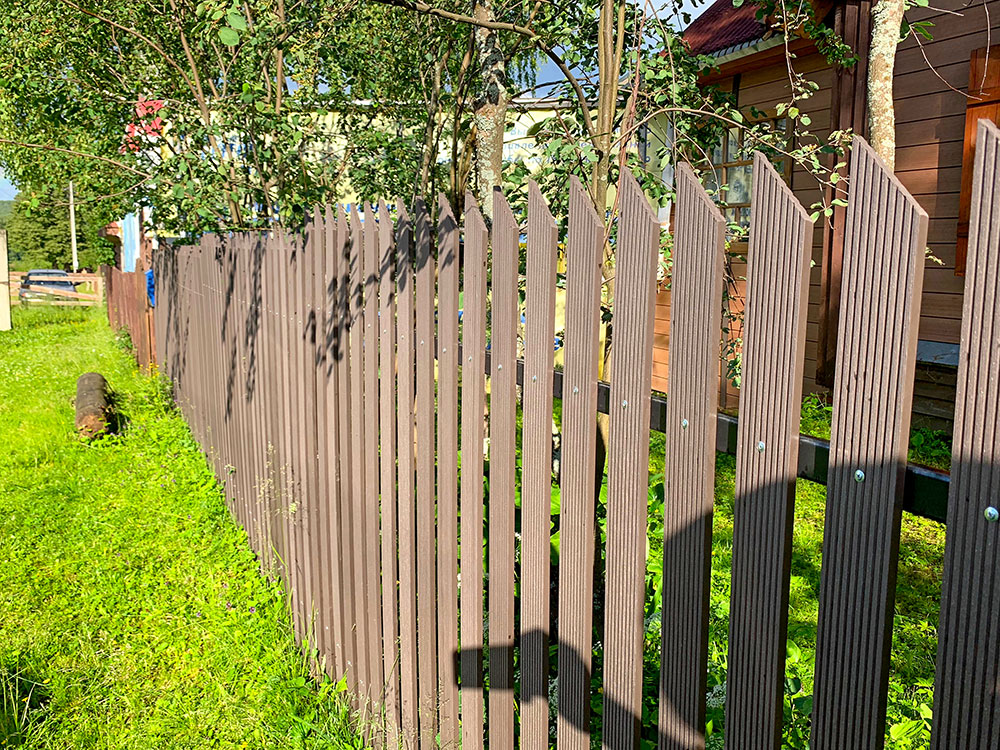 Для реализации этого проекта, нам понадобился специальный узкий полнотелый штакетник из ДПК. Ведь у владельца не так много времени посещать дачу и постоянно поддерживать деревянный штакетник в идеальной форме. Для ДПК-же такой уход не требуется и достаточно просто использовать по мере необходимости специальное средство для очистки ДПК и средство для защиты декинга. И он прослужит вам долгие годы не потребовав ничего дополнительно.